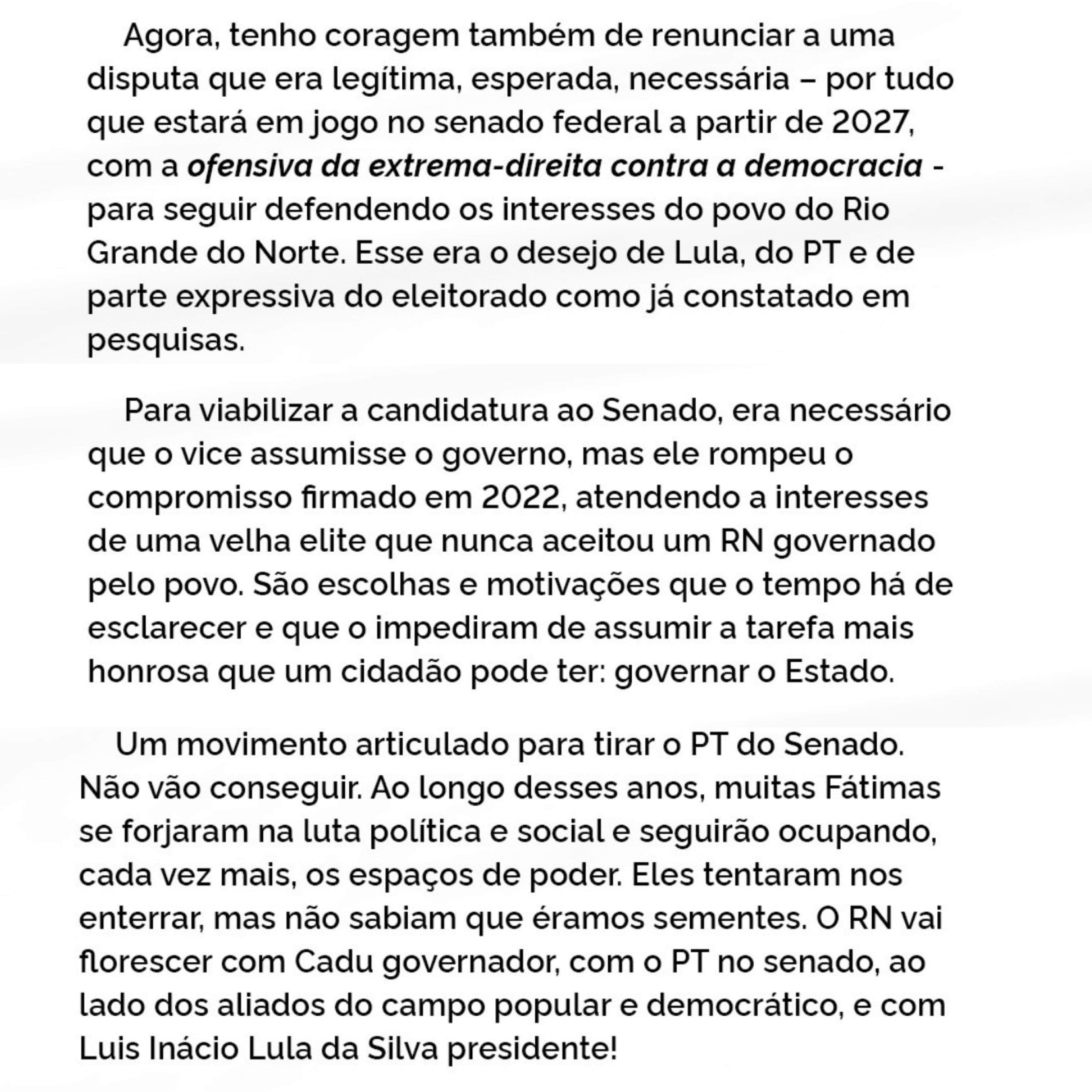 A governadora Fátima Bezerra (PT) anunciou que não irá mais renunciar ao cargo para disputar o Senado em 2026 e atribuiu sua decisão a fatores políticos que, segundo ela, envolvem uma “ofensiva da extrema-direita contra a democracia” e a quebra de compromisso por parte do vice-governador Walter Alves (MDB). Em carta pública, Fátima afirma que a candidatura ao Senado era “legítima, esperada e necessária”, mas acabou sendo inviabilizada diante do cenário político e da impossibilidade de transição no governo estadual.